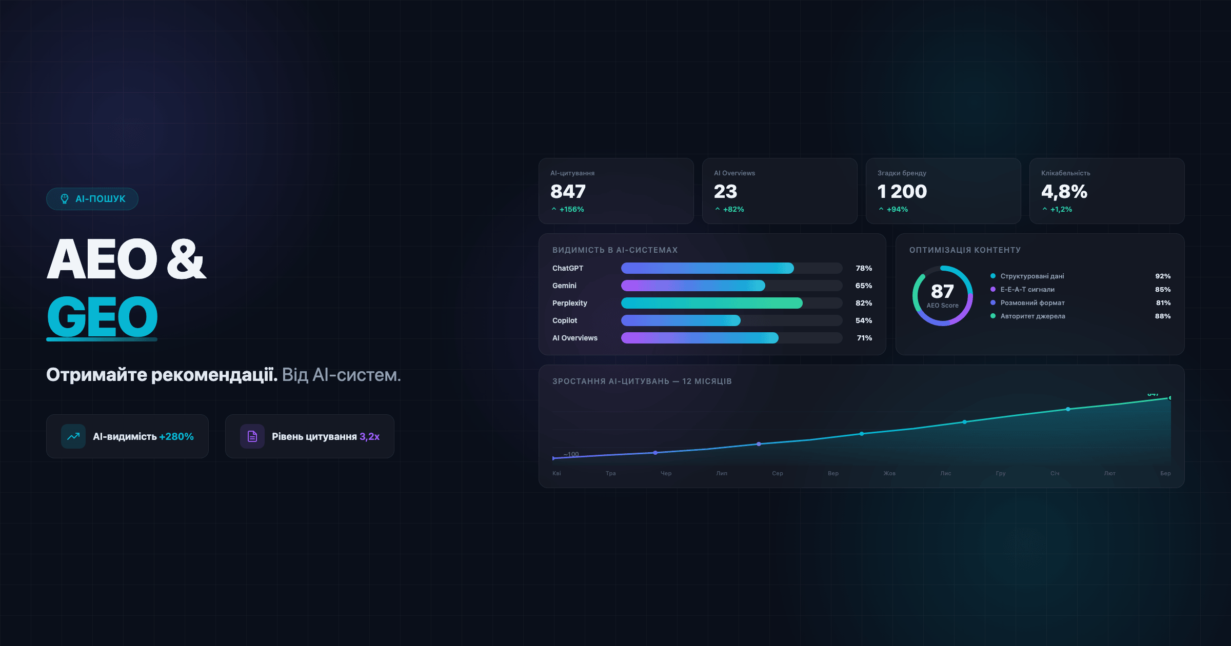 Ця зміна створила дві нові дисципліни, які кожен бізнес повинен розуміти: AEO (Answer Engine Optimization) — оптимізація контенту для того, щоб він став джерелом для AI-відповідей, та GEO (Generative Engine Optimization) — оптимізація саме для AI-пошукових систем, які генерують відповіді замість списків посилань.