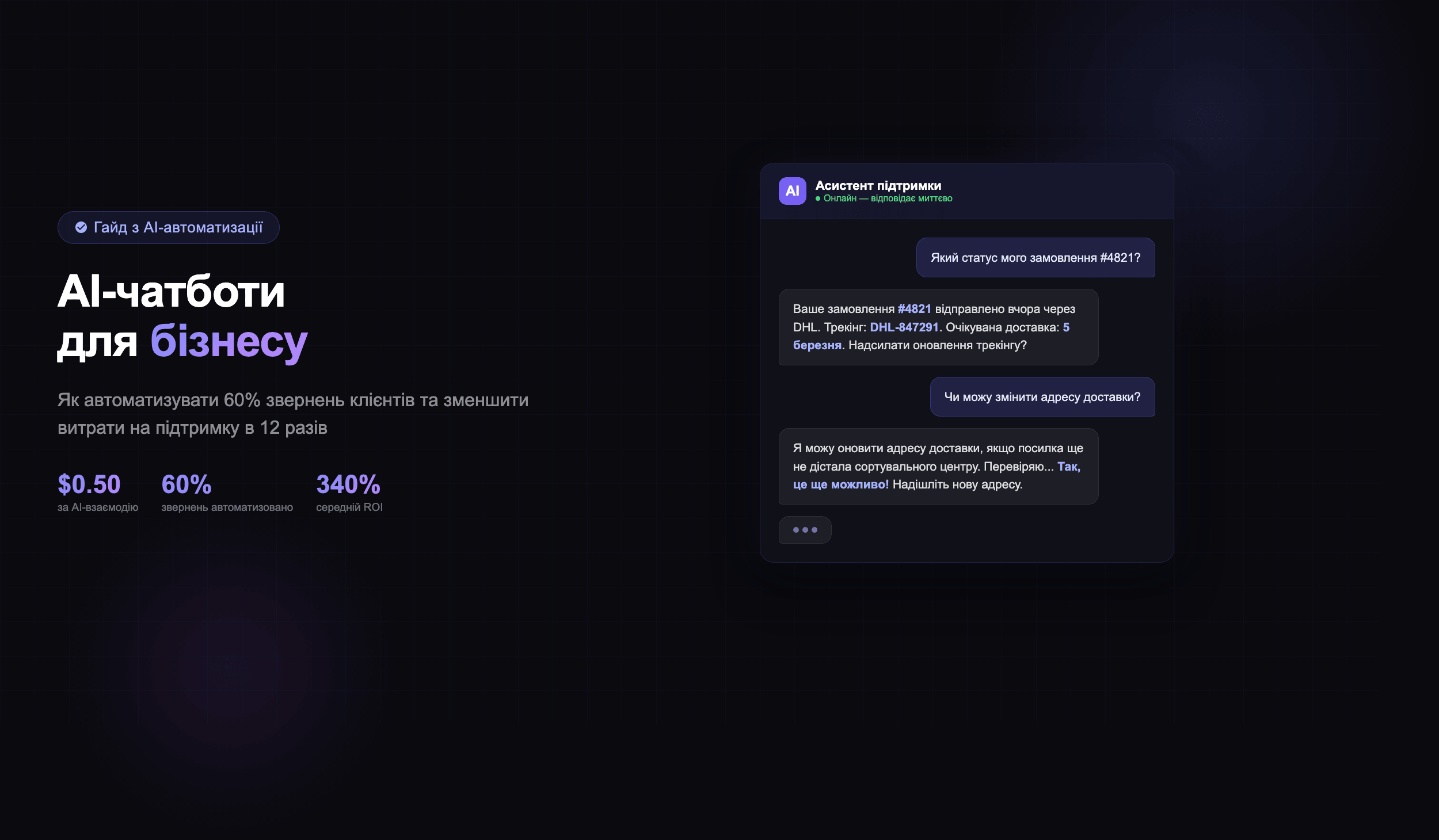 - FAQ та інформація про продукт — 85-95% автоматизації. Ваші топ-20 питань, ймовірно, становлять 60% усіх звернень. Автоматизація лише цих запитів дає миттєвий ROI.