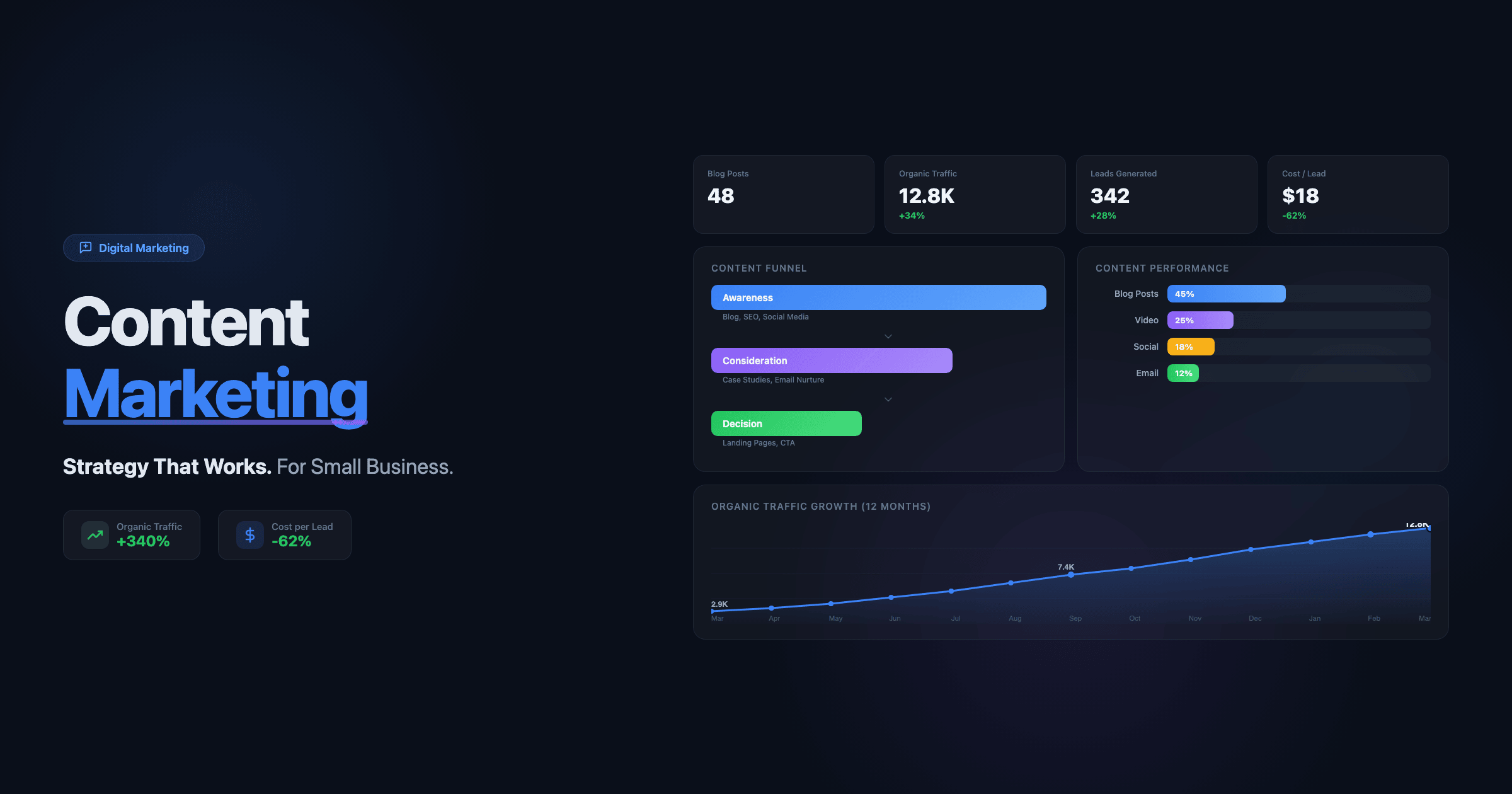 Content marketing costs 62% less than traditional marketing while generating 3x more leads. But the real advantage for small businesses isn’t cost — it’s compounding returns. Unlike paid ads where results stop when spending stops, content builds organic visibility that grows over time.