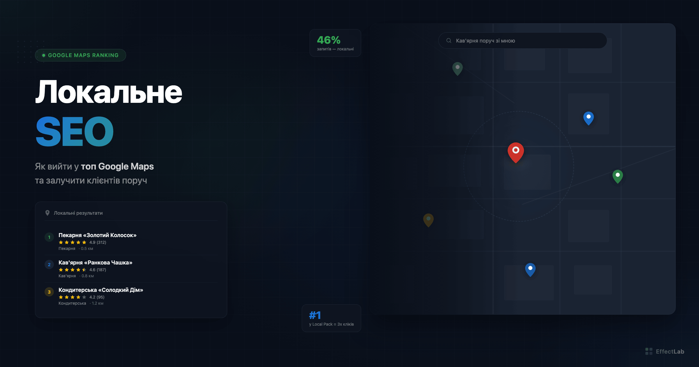Готові поставити свій бізнес на локальну карту? Зв’яжіться з EffectLab для безкоштовної консультації, і давайте виведемо ваш бізнес у топ-3 Google Maps.