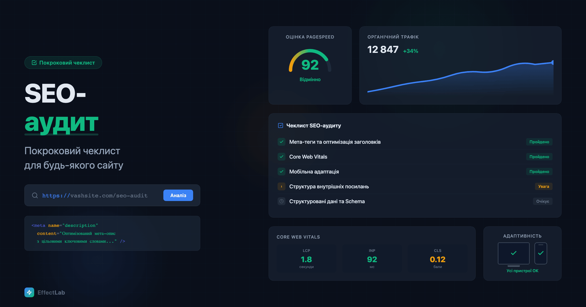 У EffectLab SEO-аудит вбудований у кожний веб-проєкт, який ми створюємо. Незалежно від того, чи ми будуємо B2B-каталог зі складною фільтрацією, чи сайт ЖК з інтерактивним підбором квартир, технічне SEO — частина фундаменту, а не доповнення. Хочете, щоб ми провели професійний аудит вашого сайту? Зв’яжіться з нами для безкоштовної початкової оцінки.