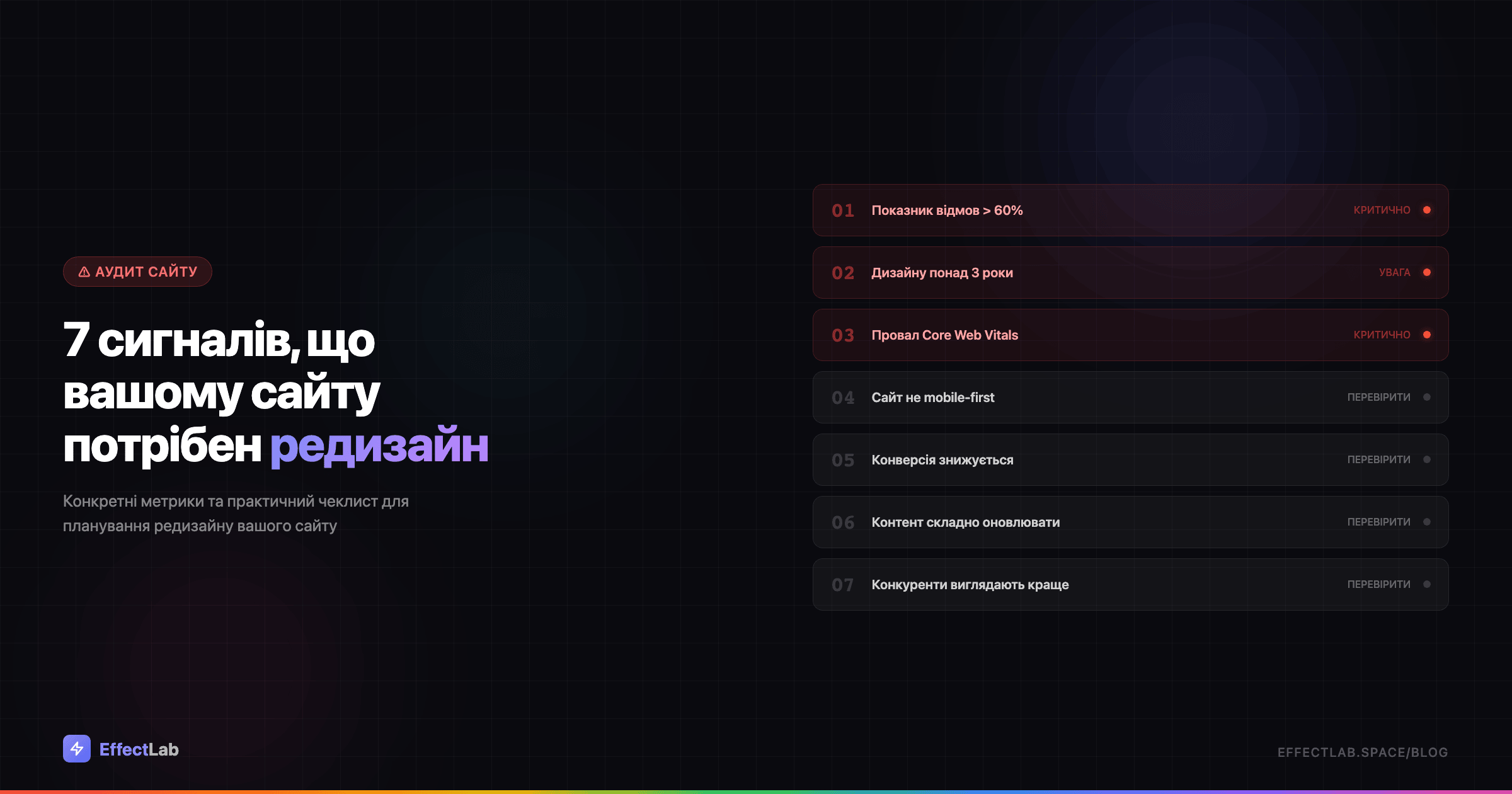 У цій статті — 7 конкретних, підкріплених даними сигналів, що вашому сайту потрібен редизайн, плюс практичний чеклист для планування проєкту. Без розмитих порад — лише метрики та рішення.